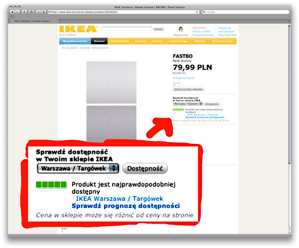 dodam tylko, ze ten system nie jest dla ludzi, ktorzy jezdza do ikea na tzw. handlowe spacery w pochmurny dzien (tzw. „ikea väder”, czyli pogoda na ikea), bo dla takich to najmniej istotne, czy towar jest na polce, czy nie. ja natomiast nie jezdze do ikea na spacery, jade tam tylko, gdy potrzebuje kupic jakis produkt, dlatego sprawdzam dostepnosc na stronie sklepu.