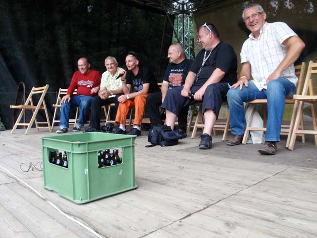 kwiat młodzieży jarocińskiej, warszawskiej i międzynarodowej; w braterskim uścisku. poranek autorski grzegorza k. witkowskiego: od lewej: adam martuzalski (acapulco), tadeusz szmidel (jarocin), guma (moskwa), walter chełstowski (jarocin + w-wa), grzegorz k. witkowski (bohater), krzysztof hajdasz (jarocin).
