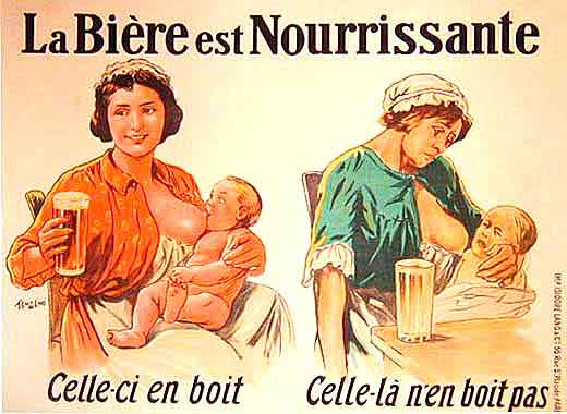 Dosyć koszmarny francuski stary plakat przestrzegający przed piciem kiepskiego (warzonego w domu) piwa. W przeciwieństwie do piwa kupionego w pijalni, które jest — jak widać — dobre dla karmiącej kobiety i dziecka. Francuzi to barbarzyński naród ;-)