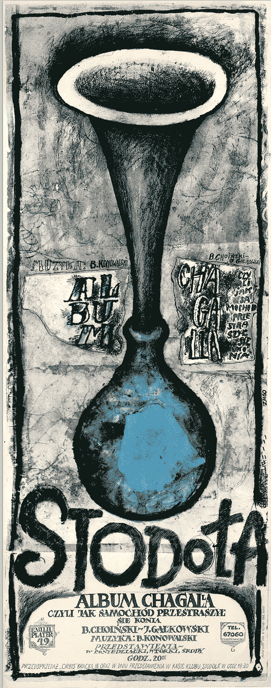 ale dziś: „album chagalla” plakat – mego ojca, bo taki mam w zbiorach; ale pewnie było jeszcze kilka fajnych innych. spektakl był ponoć taki sobie, ale plakat – a i scenografia, też rodzinna – znakomita. mówię, bo widziałem, choć miałem ledwo 8 lat w tym 1960. a zresztą: więcej nieco – opisane tam (tak! tak… o jazzie też – i o pp. Choińskim i Gałkowskim, autorach, później też – texciarzach i te pe; popularnych gdzieniegdzie… ;)